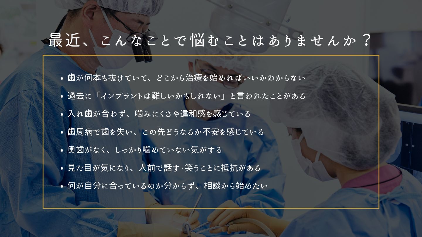 院長挨拶これらの症状に当てはまり「インプラントは諦めるしかない」とお考えかもしれません。しかし、どうかご安心ください。一般的な歯科医院はもちろん、治療を行う専門機関でさえも、技術的な難しさや症例の複雑さから対応が難しいとされる複雑な症例に対しても、これまでの研鑽に基づき真摯に対応いたします。なぜ、他院で難しいとされたケースが当院で可能になるのか?