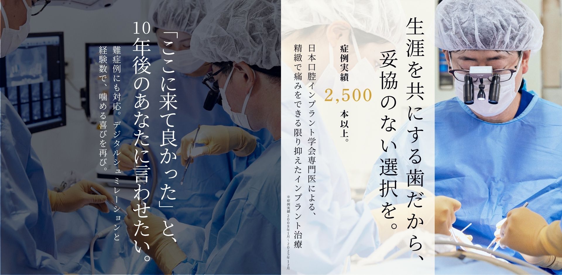 当院には、技術が求められるインプラント治療を専門とする医師が在籍し、他院では対応が困難な骨造成技術を、豊富な実績に基づいて日常的に実施しています。実際、当院には治療が難しいと判断された患者様がご紹介で多くご来院されています。「入れ歯にするしかない」と決意されていた方が、再びインプラントで快適な生活を取り戻されています。あなたのインプラント治療の可能性を、私たちともう一度探してみませんか。まずは、お気軽にご相談ください。