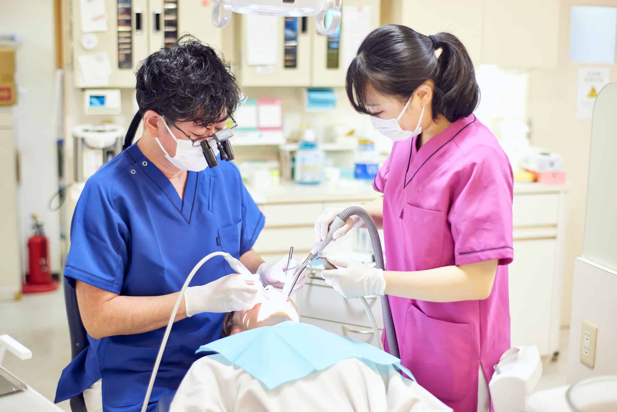 当院では、歯科医師、手術室看護師、歯科衛生士、歯科技工士、歯科麻酔医、歯科助手が連携し、各分野の知識を活かしながら患者様の状態に合わせたインプラント治療を行っています。複数のスタッフが関わることで、診査から治療後のケアまでを一貫してサポートできる体制を整えています。痛みや不安に配慮した処置を心がけ、インプラント治療の知識・技術の研鑽を続けることはもちろん、丁寧でわかりやすいご説明を心がけています。